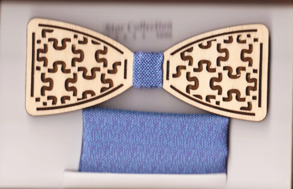 Originální pánský dřevěný motýlek. Krásné dárkové balení v krabičce, velký kapesníček z kvalitního saténu. Připevnění kolem krku pomocí stužky.