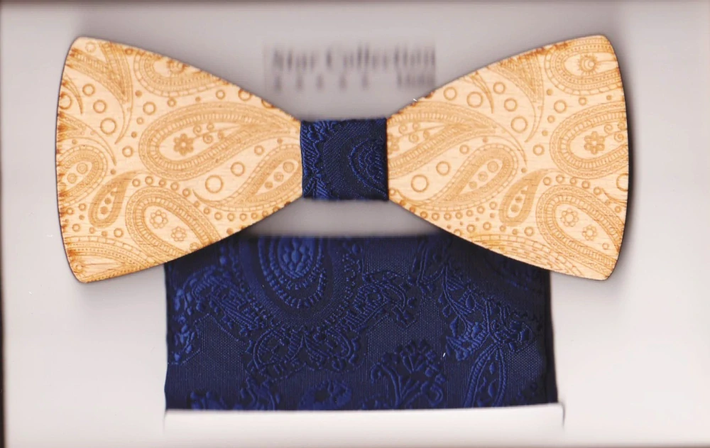 Originální pánský dřevěný motýlek. Krásné dárkové balení v krabičce, velký kapesníček z kvalitního saténu. Připevnění kolem krku pomocí stužky.